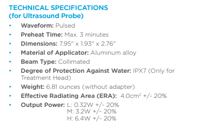 - Watertight for use in underwater therapy for 30 mins at a depth of 1 meter (Ultrasound head only – IPX7).